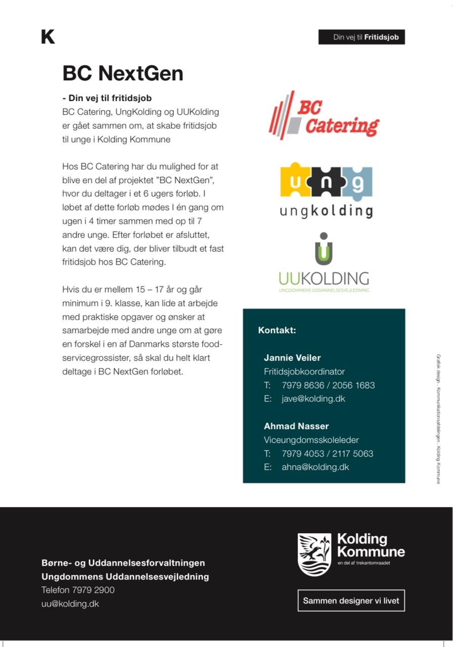 Fritidsjobprojekt BC NextGen er et samarbejde mellem, BC Catering, UngKolding og UU Kolding som er gået sammen om, at skabe fritidsjob til unge i Kolding Kommune.