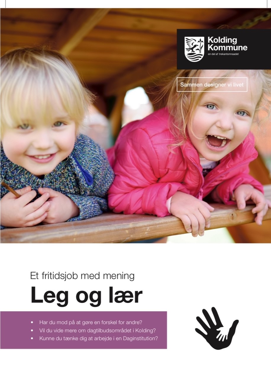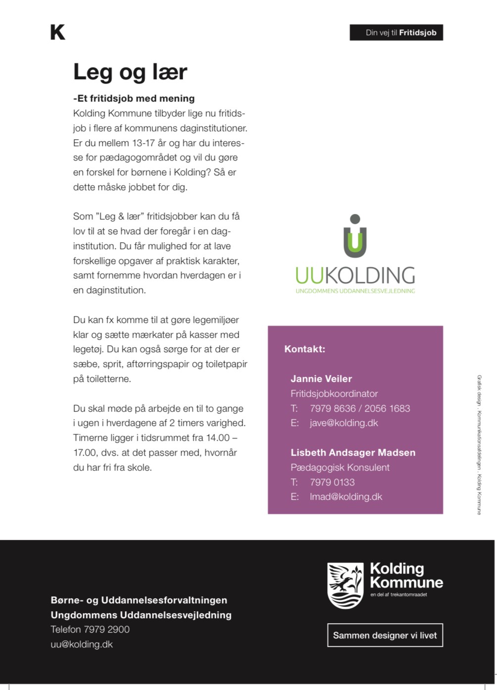 Leg & Lær er et samarbejde mellem UU Kolding og BUF. Som ”Leg & Lær” fritidsjobber kan de unge få lov til at se hvad der foregår i en daginstitution.