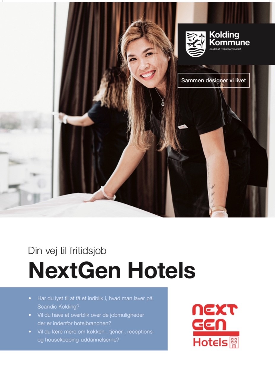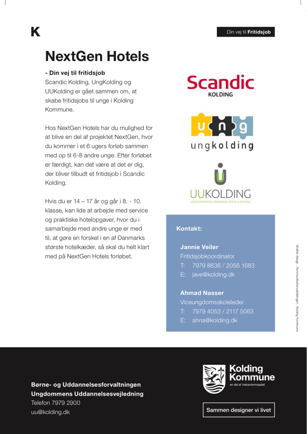 Fritidsjobprojekt NeXtGen Hotels er et samarbejde mellem Scandic Kolding, UngKolding og UU Kolding som er gået sammen om at skabe fritidsjob til unge i Kolding Kommune.
