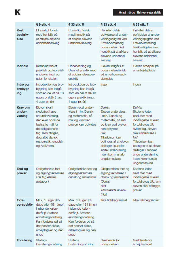 - Skal indeholde undervisning og ulønnet praktik med uddannelsesperspektiv