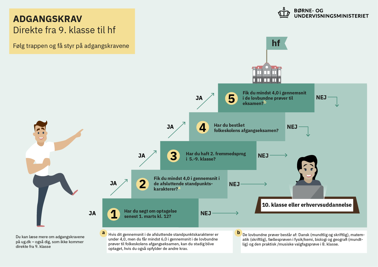 - have fået mindst 5,0 i gennemsnit af de afsluttende standpunktskarakterer i 9. klasse